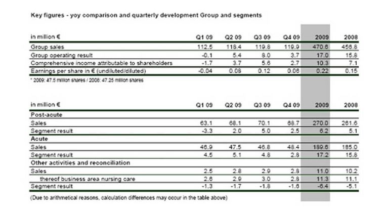 For the 2010 financial year, the Management Board anticipates sales on the previous year’s level, as long as framework conditions in the industry do not change drastically. Achieving a result comparable with the previous year is intended, mainly through efficiency gains and stringent cost management. In relation to external growth, acquisition efforts in the acute sector are the main focus.
