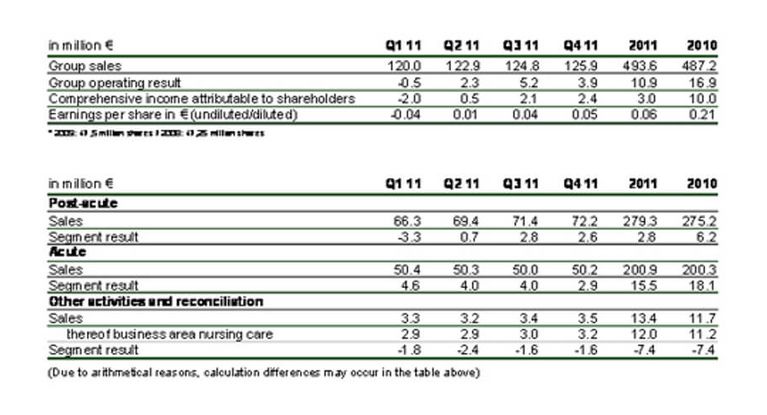 Group operating result (earnings before interest and taxes) was EUR 10.9 mill.,which was EUR 6.0 mill. lower than the previous year. In the post-acute segment, thesegment result decreased von EUR 6.2 mill. to EUR 2,8 mill. and the acute segment result decreased fromEUR 18.2 mill. toEUR 15.2 mill. Despite the rise in sales, the cost of raw materials and consumables used wasEUR 110.4 mill., nearly on the same level as the previous year. Personnel costs increased by EUR 11.6 mill. up to EUR 278.6 mill. compared to the previous year.