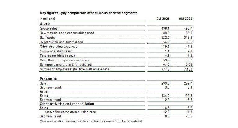 In the first nine months of 2021, MEDICLIN generated Group sales of EUR 498.1 mill. Sales include EUR 13.7 mill. from benefits under the protective shield to manage the coronavirus pandemic, down from EUR 37.7 mill. in the prior-year period. At operating level, without benefits under the protective shield, Group sales increased by EUR 23.3 mill. or 5.1 % compared to the previous year’s period. Capacity utilization in the 9-month period of 2021 was 74.7%, one percentage point above the previous year's figure