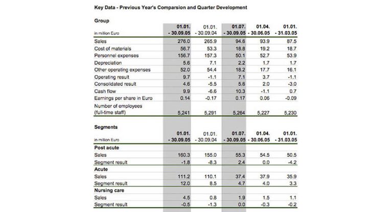 The third quarter of 2005 was MediClin’s most successful quarter for the past two years. The operating result generated in this quarter was 7.1 million Euro and consolidated net profit amounted to 5.6 million Euro. Earnings per share were 0.17 Euro for the quarter (previous year’s quarter: 0.06 Euro).