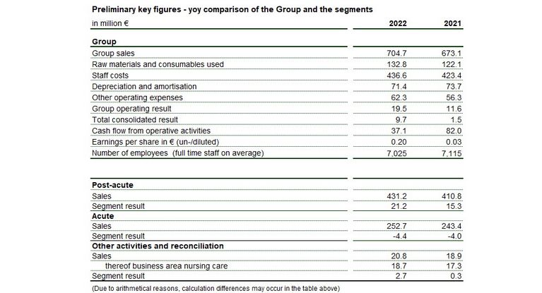 In the 2022 financial year MEDICLIN achieved Group sales in the amount of EUR 704.7 mill. (previous year: EUR 673.1 mill.) and a Group operating result of EUR 19.5 mill. (previous year: E§UR 11.6 mill.). As a result, both Group sales and group operation result were within the corridor of the forecast published for the year 2022.