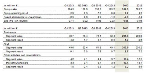 The Group operating result in FY 2013 was EUR 2.2 mill.; EUR 2.1 mill. below previous year’s figure. In the following quarters the low result of the first quarter 2013 (Q1 2013: EUR -5.9 mill.; Q1 2012: EUR -0,8 mill.) could be catched up partly by adjustments of medical services and reallocation of capacities as well as cost savings.