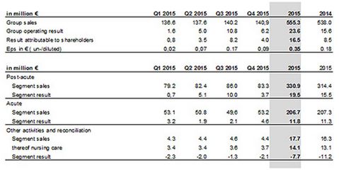 Offenburg, February 19, 2016 - MEDICLIN Aktiengesellschaft (MediClin) achieved Group sales of EUR 555.3 mill. in the FY 2015. The sales plus was EUR 17.3 mill. or 3.2% against previous year. The preliminary Group operating result (Group-EBIT) increased from EUR 15.6 mill. to EUR 23.6 mill. and the preliminary result attributable to shareholders of MediClin AG from EUR 8.5 mill. to EUR 16.5 mill. Earnings per share account to EUR 0.35 (previous year: EUR 0.18).