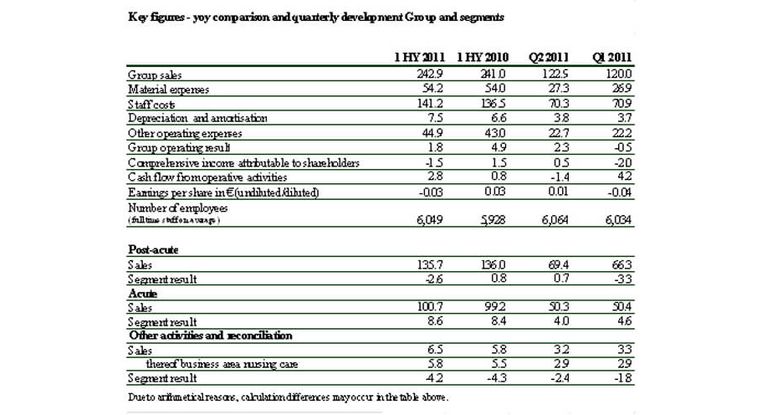 Sales revenues in the post-acute segment in the first half-year of 2011 almost reached the level achieved in the previous year at EUR 135.7 mill. (1 HY 2010: EUR 136.0 mill.). After deducting the higher operating costs (EUR +4.5 mill.), there was a negative segment result of EUR -2.6 mill. (1 HY 2010: EUR +0.8 mill.). However, this result was an improvement by EUR 4.0 mill. in comparison to the first quarter of 2011 (EUR -3.3 mill.).