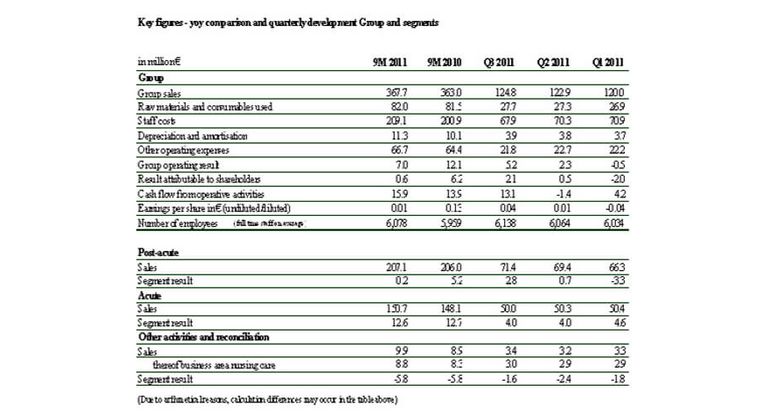 Sales in the post-acute segment increased by EUR 1.1 mill. or 0.6% up to EUR 207.1 mill. (9 M 2010: EUR 206.0 mill.) compared to the previous year’s value. Segment result was EUR 0.2 mill. (9 M 2010: EUR 5.2 mill.). Against last year the slight increase in sales could not compensate the higher expenses including depreciation of about EUR 7.7mill.
