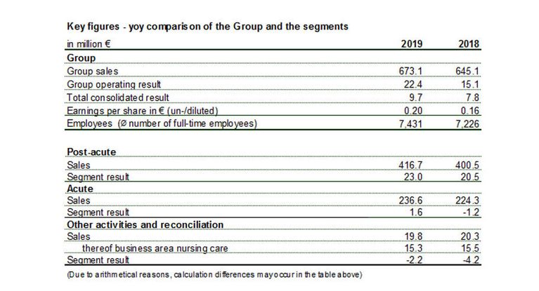 MEDICLIN Aktiengesellschaft (MEDICLIN) has achieved Group sales of EUR 673.1 mill. (previous year: EUR 645.1 mill.) in the 2019 financial year. Sales plus amounts to EUR 28.0 mill or 4.3 %.