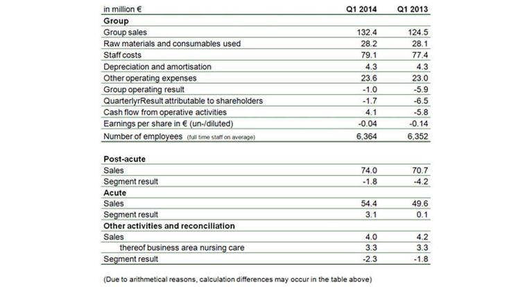 The quarterly comparison shows that sales of the post-acute segment of EUR 74.0 mill. was EUR 3.3 mill. and sales of the acute segment of EUR 54.4 mill. was EUR 4.8 mill. or 9.8 % up against previous year’s values. The nursing care business area showed sales of EUR 3.3 mill. on previous year’s level. Higher sales and less increase of expenses than sales led to result improvements in the two above-named segments. The segment result of post-acute was EUR -1.8 mill. (Q1 2013: EUR -4.2 mill.), the result of the acute segment EUR 3.1 mill. (Q1 2013: EUR 0.1 mill.).