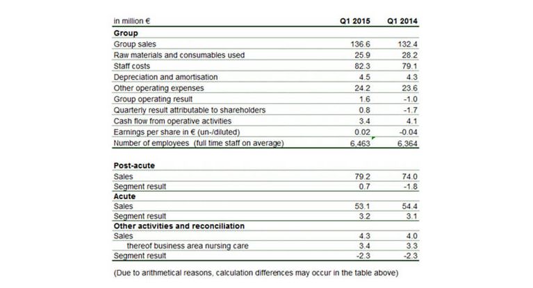 Sales of the post-acute segment amounted to EUR 79.2 mill. (Q1 2014: 74.0 mill.) being about EUR 5.2 mill. above the value of previous year’s quarter. The newly established capacities in psychosomatic and in neurology and in the meantime also in geriatric have contributed to the sales increase just as in the second half-year of 2014. Sales in the acute segment were EUR 53.1 mill. (Q1 2014: EUR 54.4 mill.), it decreased by EUR 1.3 mill. Sales in the business area nursing care increased by EUR 0.1 mill. despite a lower number of places.