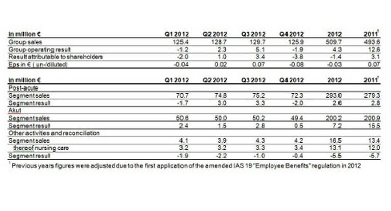EUR 13.7 mill. out of EUR 16.1 mill. sales increase applied to the post-acute segment. Sales of the acute segment decreased slightly by EUR 0.7 mill. The result of the post-acute segment lies at EUR 2.6 mill. (2011: EUR 2.8 mill.) due to a strong decrease in occupancy at the end of the year. The acute segment result decreased to EUR 7.2 mill. from EUR 15,5 mill. because additional services were not or not totally compensated and especially staff costs increased compared to last year. The development of the business field nursing care was very satisfying, sales increased by EUR 1.1 mill. to EUR13.1 mill. The occupancy was at 96.2% (2011: 94.7%).