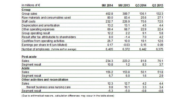 The business development of the first nine months 2014 leads to the expectation that the predicted sales targets of the Group (+3.0 %) and of the segments post-acute (+4.5 % to +5.0 %) and acute (+1.0 % to +1.5%) will be achieved. The earning targets of EUR 4 to 6 mill. for the Group operating result will be slightly increased.