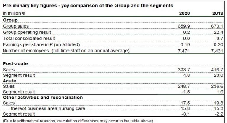 In the 2020 financial year, Group sales of MEDICLIN Aktiengesellschaft (MEDICLIN) of EUR 659.9 mill. were EUR 13.2 mill. or 2.0% below the previous year's value. The preliminary Group operating result is EUR 0.2 mill. (previous year: EUR 22.4 mill.).
