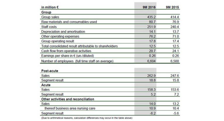 The business performance in the first nine months of the 2016 financial year indicates that the sales target of 3.0 % growth announced for the Group will be exceeded. The Management Board anticipates sales growth in the range of approximately 4.5 %. Provided the post-acute segment continues to perform well, Group EBIT will be in line with the forecast range (guidance: Group EBIT between EUR 24 mill. and EUR 26 mill.).