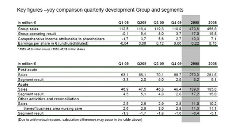 MediClin achieved revenues of 470.6 million EUR (2008: 456.8 million EUR) – compared with the previous year a rise of 3.0%. It achieved a preliminary Group operating result of 17.0 million (2008: 15.8 million EUR). The preliminary comprehensive income attributable to shareholders of MediClin amounted to 10.3 million EUR (2008: 7.1 million Euro).