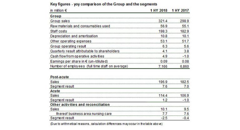 Offenburg, 2 August 2018 – In the first six months of 2018 MEDICLIN Aktiengesellschaft achieved Group sales amounting to EUR 321.4 mill., thus EUR 22.5 mill. or 7.5 % higher than the value of the first half year of 2017. The Group operating result improved by EUR 0.7 mill. from EUR 5.6 mill. up to EUR 6.3 mill.