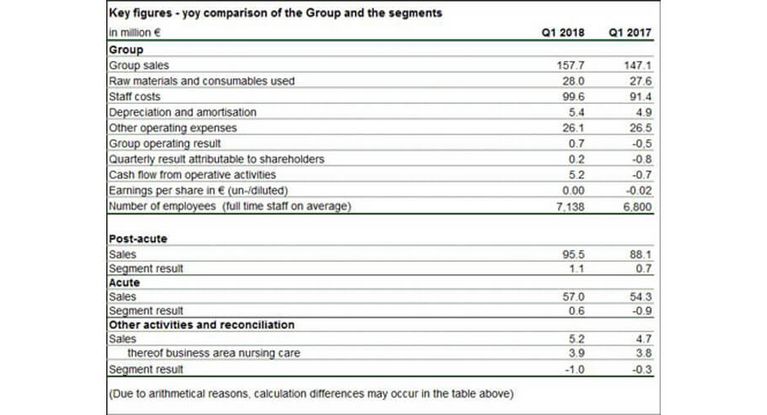 Sales in the post-acute segment climbed by EUR 7.4 mill., of which some EUR 1.2 mill. were contributed by the medical facilities acquired in the second quarter of 2017. The acute segment was able to increase sales by EUR 2.7 mill., while the nursing care business area grew by EUR 0.1 mill. Thus, the positive sales development seen in the second half of 2017 continued in the first quarter of the new financial year.