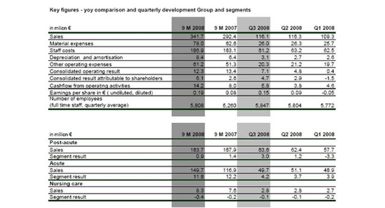 Frankfurt am Main, November 7, 2008 – In the first nine months of 2008 Group sales of EUR 341.7 million were achieved, thus being EUR 49.3 million or 16.9% above previous year’s value. Cleared of the turnover from the clinics of the Kraichgau-Klinik AG, which totalled EUR 38.8 million, Group sales would have been EUR 10.5 million or 3.6% higher than in the previous year. The Group result of operations (EBIT) for the first nine months of 2008 amounts to EUR 12.3 million (9 M 2007: EUR 13.4 mill.) Compared with the previous year’s period higher rent expenses totalled up to EUR 5.9 million. Furthermore pleasing is the development of the occupancy rates, being 86.4% (9 M 2007: 84.2%) Group-wide in the meantime.