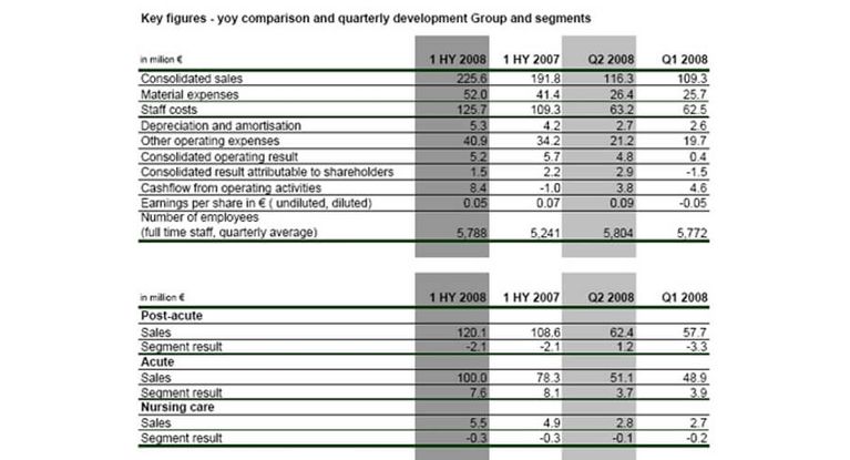 Frankfurt am Main, August 8, 2008 – In the first half-year of 2008, Group sales of EUR 225.6 mill. were achieved, thus being 17.6% above previous year’s value. Cleared of the turnover from the Kraichgau-Klinik Group, which totalled EUR 25.3 mill., Group sales would have been EUR 200.3 mill. and thus EUR 8.5 mill. or 4.5% higher than in the previous year. The Group result of operations (EBIT) for the first half-year of 2008 amounts to EUR 5.2 mill. (1. HY 2008: EUR 5.7 mill.) Compared with the previous year’s period higher rent expenses totalled up to EUR 3.9 mill. The contribution from the 2nd quarter of 2008 is EUR 4.8 mill. and thus significantly higher than the operational result in the 1st quarter (Q1 2008: EUR 0.4 mill.). This was achieved despite sharply risen personnel and material costs. Pleasing is the development of the occupancy rates, being 85.7% (1. HJ 2007: 83.0%) Group-wide in the meantime.