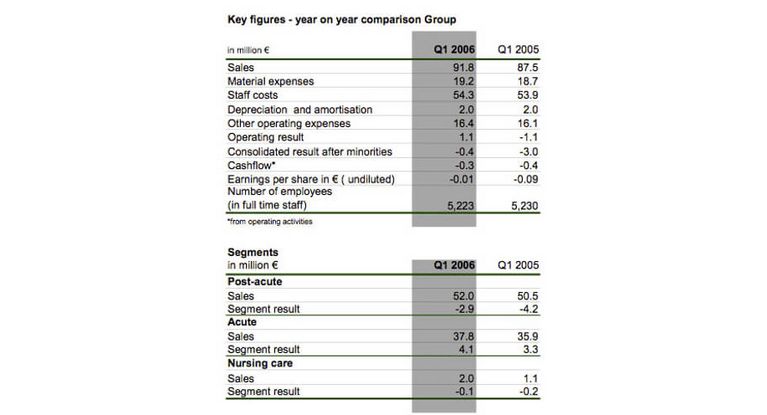 Sales increased in all three segments compared to the same quarter in the previous year. In the post-acute segment, the number of nursing days was 1.9% and the number of cases treated 2.0% above the figures for the first quarter of 2005. In the acute segment, the number of cases treated rose 2.9% over the previous year's level while the number of nursing days decreased by 1.2% due to the shorter duration of stay.