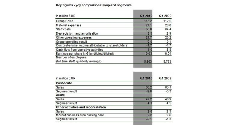 The increase in sales could compensate the higher costs, so that the quarterly operating result of the Group improved slightly against the comparable previous year’s value (Q1 2010: EUR -0.02 mill.; Q1 2009: EUR -0.06 mill.). The post-acute segment result improved by EUR 1.3 mill. up to EUR -2.0 mill. (Q1 2009: EUR -3.3 mill.), the acute segment result amounted to EUR 4.1 mill. (Q1 2009: EUR 4.5 mill.).