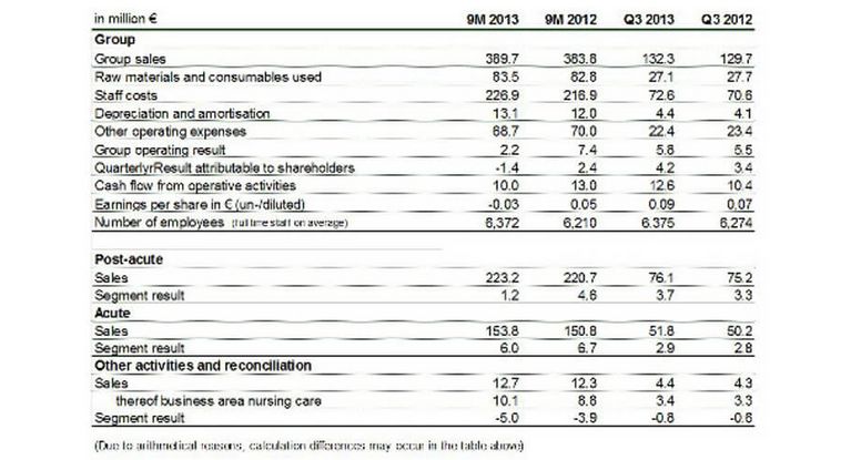 Comparing the first nine months of the financial years, segment results were still below the previous year‘s value, Comparing the quarters, higher sales affected the earnings development positively. The post-acute segment reports for the first nine months of 2013 a segment result of EUR 1.2 mill. (9M 2012: EUR 4.6 mill.) and for the third quarter a result of EUR 3.7 mill. (Q3 2012: EUR 3.3 mill.). In the first nine months of 2013 the acute segment achieved a segment result of EUR 6.0 mill. (9M 2012: EUR 6.7 mill.) and EUR 2.9 mill. in the third quarter of 2013 (Q3 2012: EUR 2.8 mill.).