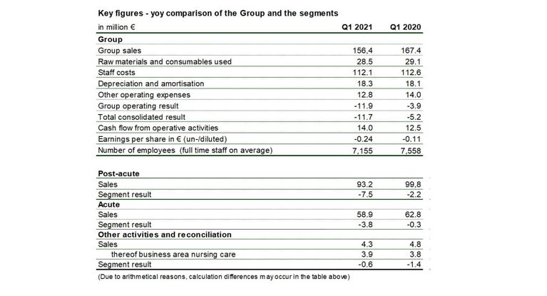 In the 1st quarter of 2021, Group sales amounted to EUR 156.4 mill. and were EUR 11.0 mill. or 6.6% below the value of the 1st quarter of 2020. Group sales include a total of EUR 7.6 mill. in protective shielding benefits for free capacities and payments on the part of the cost providers for additional expenses for hygiene and protective materials.