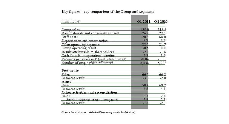 Despite increased Group sales the Group’s operating result of EUR –0.5 mill. was EUR 0.5 mill. less than the previous year’s value. Decisive here were primarily higher quarter-on-quarter staff costs (EUR +2.9 mill.).The result attributable to the shareholders of MediClin amounted to EUR–2.0 mill. (Q1 2010: EUR -1.6 mill.).