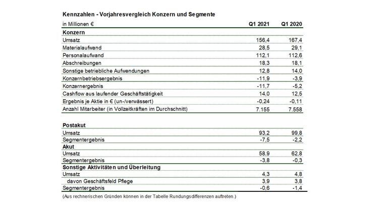 Im 1. Quartal 2021 betrug der Konzernumsatz 156,4 Mio. Euro und lag um 11,0 Mio. Euro oder 6,6% unter dem Wert des 1. Quartals 2020. Enthalten sind im Konzernumsatz insgesamt 7,6 Mio. Euro Schutzschirmleistungen für freie Kapazitäten sowie Leistungen seitens der Kostenträger für Mehraufwendungen bei den Hygiene- und Schutzmaterialien.