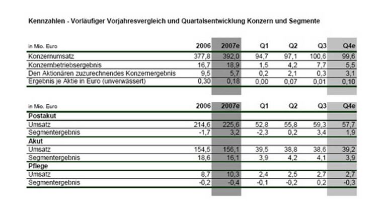 Deutlich gestiegene Fallzahlen im Segment Postakut führten zu einem Umsatzanstieg in Höhe von 11,0 Mio. Euro oder 5,1%, so dass sich das vorläufige Segmentergebnis auf plus 3,2 Mio. Euro verbessern konnte. Die Auslastung in diesem Segment lag in 2007 bei 84,8% (VJ: 77,9%). In den Segmenten Akut und Pflege erhöhte sich der Umsatz ebenfalls; das Segment Akut konnte aber mit einen vorläufigen Segmentergebnis in Höhe von 16,1 Mio. Euro den guten Vorjahreswert (18,6 Mio. Euro) wegen höherer Belastungen nicht erreichen.
