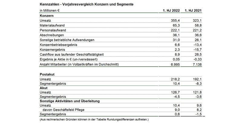 Eine steigende Nachfrage nach den medizinischen, therapeutischen und pflegerischen Leistungen der MEDICLIN führte im Konzern zu einem Umsatz- und Ergebnisanstieg im 1. Halbjahr 2022 gegenüber dem Vergleichszeitraum des Vorjahres. Die Zahl der stationär behandelten Patienten stieg um 11,9 % auf 51.891 Patienten und die Auslastung um 6,6 Prozentpunkte auf 78,1 %. Der Vorstand geht für das Geschäftsjahr 2022 weiterhin von einem Konzernumsatz und Konzernbetriebsergebnis über den Vorjahreswerten aus.