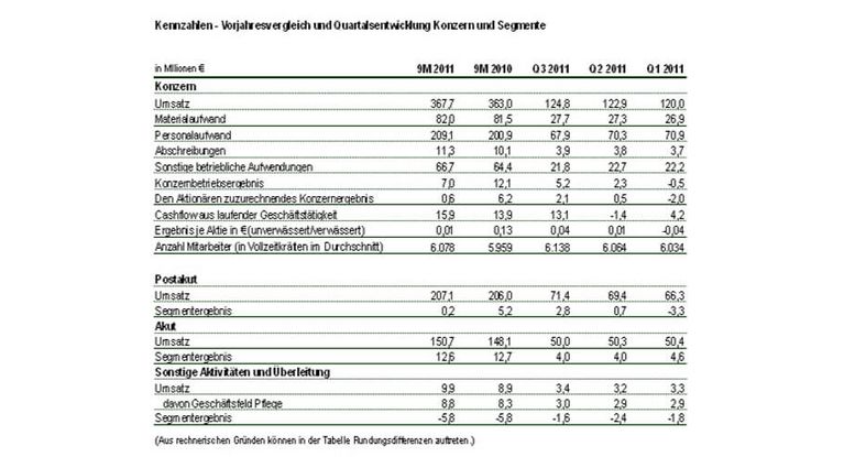 Die Umsatzerlöse im Segment Postakut erhöhten sich um 1,1 Mio. Euro oder 0,6% auf 207,1 Mio. Euro (9 M 2010: 206,0 Mio. Euro) gegenüber dem vergleichbaren Vorjahreswert. Das Segmentergebnis betrug 0,2 Mio. Euro (9 M 2010: 5,2 Mio. Euro). Der gegenüber dem Vorjahr nur leichte Umsatzanstieg konnte die um rund 7,7 Mio. Euro höheren Aufwendungen einschließlich Abschreibungen nicht kompensieren.