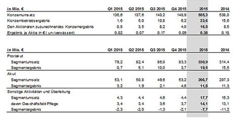 Den größten Anteil am Umsatzwachstum hatte das Segment Postakut mit 16,5 Mio. Euro. Das Segment erzielte einen Umsatz in Höhe von 330,9 Mio. Euro (Vorjahr: 314,4 Mio. Euro). Das Geschäftsfeld Pflege erwirtschaftete 14,1 Mio. Euro Umsatz und steuerte 1,0 Mio. Euro zum Umsatzwachstum bei. Im Segment Akut lag der Umsatz in Höhe von 206,7 Mio. Euro um 0,6 Mio. Euro unter dem Vorjahreswert. In den Segmenten Postakut und Akut erhöhte sich das Segmentergebnis gegenüber dem Vorjahr um 4,0 Mio. Euro bzw. 0,5 Mio. Euro. Im Segment Postakut konnten die gestiegenen Personalkosten durch den deutlich höheren Umsatz und die gegenüber dem Vorjahr geringeren Materialkosten mehr als kompensiert werden. Im Segment Akut führten die geringeren Material- und Personalkosten trotz des leichten Umsatzrückgangs zu einem Ergebnisanstieg.