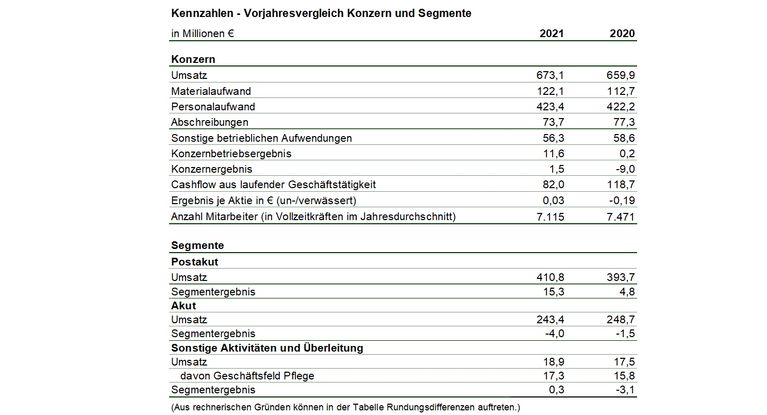 MEDICLIN erzielte im Geschäftsjahr 2021 einen Konzernumsatz in Höhe von 673,1 Mio. Euro und lag damit um 2,0 % über dem Vorjahreswert. „Die positive Entwicklung beim Konzernumsatz zeigt sich insbesondere dann, wenn man die Entwicklung ohne die in beiden Jahren zugeflossenen Schutzschirmleistungen und eines Desinvestments im Jahr 2020 betrachtet. Rein operativ verbesserte sich der Konzernumsatz um 44,2 Mio. Euro bzw. 7,3%“, ergänzte Tino Fritz, Finanzvorstand der MEDICLIN.
