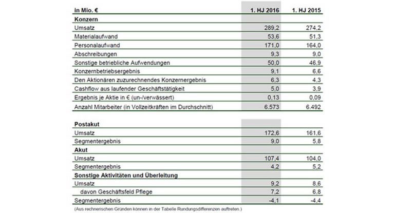 Im Segment Postakut lag der Umsatz in Höhe von 172,6 Mio. Euro um 11,0 Mio. Euro über dem Wert des Vergleichszeitraums des Vorjahres. Zum Umsatzanstieg hat die gute Auslastung der Kapazitäten in der Neurologie und der Akut-Neurologie, in der Psychosomatik, in der Orthopädie sowie in der Geriatrie beigetragen. Das Segmentergebnis erhöhte sich um 3,2 Mio. Euro auf 9,0 Mio. Euro. Im Segment Akut wurden Umsatzerlöse in Höhe von 107,4 Mio. Euro erzielt. Der Umsatzanstieg in Höhe von 3,4 Mio. Euro resultierte überwiegend aus dem 2. Quartal 2016. Das Segmentergebnis in Höhe von 4,2 Mio. Euro lag um 1,0 Mio. Euro unter dem Vorjahreswert im Wesentlichen aufgrund eines höheren Material- und Personalaufwands. Der Umsatz des Geschäftsfelds Pflege erhöhte sich um 0,4 Mio. Euro auf 7,2 Mio. Euro aufgrund einer um 1,1 Prozentpunkte höheren Auslastung.