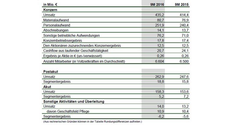 Die Geschäftsentwicklung der ersten neun Monate 2016 lässt erwarten, dass das für den Konzern gegebene Umsatzziel von 3,0 % Wachstum voraussichtlich übertroffen wird. Der Vorstand geht von einem Umsatzwachstum in der Größenordnung von rund 4,5 % aus. Das Konzern-EBIT wird vorbehaltlich einer weiterhin guten Entwicklung im Segment Postakut innerhalb der gegebenen Prognose von 24 bis 26 Mio. Euro liegen.