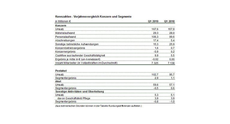 Ausgewiesen wird für das 1. Quartal 2019 ein Konzernbetriebsergebnis in Höhe von 1,6 Mio. Euro (Q1 2018: 0,7 Mio. Euro). Im Segment Postakut lag das Segmentergebnis bei 2,9 Mio. Euro und im Segment Akut bei -0,5 Mio. Euro.