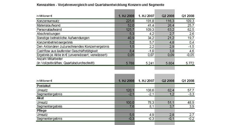 Frankfurt am Main, 8. August 2008 – Im 1. Halbjahr des Geschäftsjahres 2008 wurde ein Konzernumsatz in Höhe von 225,6 Mio. Euro erzielt, der damit um 17,6% über dem Vorjahreswert liegt. Ohne die Umsatzerlöse der Kraichgau-Klinik Gruppe in Höhe von 25,3 Mio. Euro hätte der Umsatz bei 200,3 Mio. Euro und damit um 8,5 Mio. Euro oder 4,5% über Vorjahr gelegen. Das operative Konzernergebnis (EBIT) im 1. Halbjahr 2008 betrug 5,2 Mio. Euro (1. HJ 2007: 5,7 Mio. Euro). Die gegenüber dem Vorjahreszeitraum höheren Mietaufwendungen summierten sich auf 3,9 Mio. Euro. Der Ergebnisbeitrag des 2. Quartals 2008 in Höhe von 4,8 Mio. Euro liegt deutlich über dem operativen Ergebnis des 1. Quartals 2008 (0,4 Mio. Euro) – und dies trotz der stark gestiegenen Personal und Materialkosten. Erfreulich ist die Entwicklung der Auslastung, sie liegt inzwischen im Konzern bei 85,7% (1. HJ 2007: 83,0%).