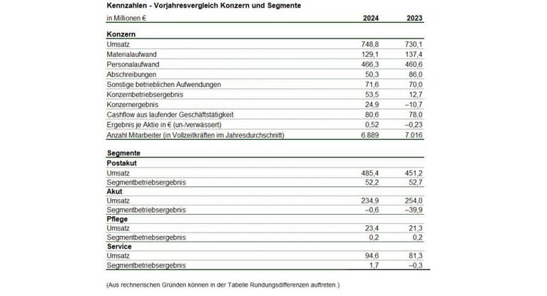 Im Segment Postakut erhöhte sich der Umsatz um 7,6 % auf 485,4 Mio. Euro (Vorjahr: 451,2 Mio. Euro). Dabei wurde ein Betriebsergebnis von 52,3 Mio. Euro erzielt (Vorjahr: 52,7 Mio. Euro), was einem Rückgang von 0,4 Mio. Euro bzw. 0,8 % entspricht. Die Umsatz- und Ergebnisentwicklung des Segments Postakut ist auch durch einen Beitrag der in 2024 zugekauften Reha-Klinik am Sendesaal positiv beeinflusst.