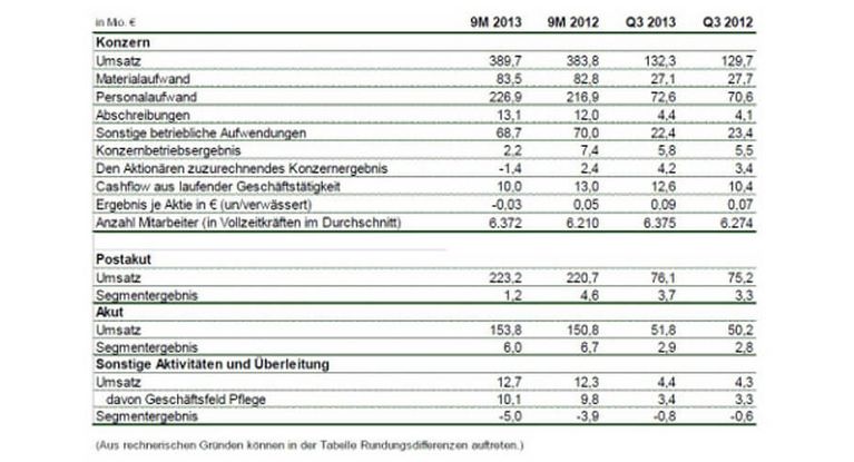 Im 9-Monats-Vergleich und im Quartalsvergleich weisen die beiden Segmente Postakut und Akut sowie das Geschäftsfeld Pflege Umsatzsteigerungen aus. In den ersten neun Monaten 2013 lag der Umsatz des Segments Postakut bei 223,2 Mio. Euro (+1,1%), der Umsatz des Segments Akut bei 153,8 Mio. Euro (+2,0%) und das Geschäftsfeld Pflege steuerte 10,1 Mio. Euro (+3,4%) zum Gesamtumsatz bei. Im 3. Quartal 2013 stieg der Umsatz im Segment Postakut auf 76,1 Mio. Euro (+1,2%), im Segment Akut auf 51,8 Mio. Euro (+3,2%) und im Geschäftsfeld Pflege auf 3,4 Mio. Euro (+0,9%).