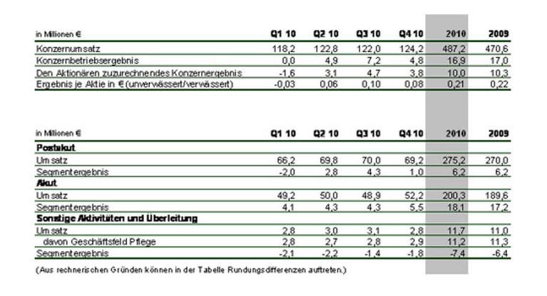 Nicht gestiegen ist das Konzernbetriebsergebnis. Es liegt mit 16,9 Mio. Euro knapp unter dem Ergebnis von 2009 (2009: 17.0 Mio. Euro). Beeinflusst wurde das Ergebnis im Wesentlichen durch gegenüber dem Vorjahr höheren Instandhaltungsaufwendungen und die im Jahresvergleich aufgrund von Personalaufbau gestiegenen Personalkosten. Das Segmentergebnis Postakut liegt mit 6,2 Mio. Euro auf dem Vorjahresniveau. Das Segmentergebnis Akut konnte sich gegenüber dem Vorjahr verbessern und beträgt 18,1 Mio. Euro. Die EBIT-Margen liegen bei 2,2 % bzw. 9,1 %.