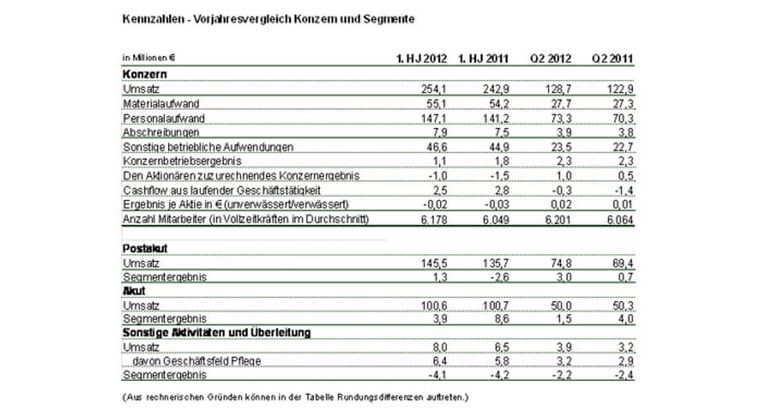 Offenburg, 10. August 2012 – Die MEDICLIN Aktiengesellschaft (MediClin) hat in den ersten sechs Monaten des Geschäftsjahres 2012 einen Konzernumsatz in Höhe von 254,1 Mio. Euro erzielt, das sind 11,2 Mio. Euro oder 4,6 % mehr als im 1. Halbjahr 2011. Ausschlaggebend für das Umsatzplus war eine deutliche Steigerung der Pflegetage und der Fallzahlen – auch die neu geschaffenen Kapazitäten sind gut ausgelastet, was zeigt, dass die Nachfrage richtig eingeschätzt wurde. Das Konzernbetriebsergebnis des 1. Halbjahres 2012 in Höhe von 1,1 Mio. Euro lag um 0,7 Mio. Euro unter dem Wert des Vorjahres – oder, bereinigt um die im Vorjahreswert enthaltenen aperiodischen Auflösungen von Rückstellungen, um 2,1 Mio. Euro über dem Vorjahreswert.