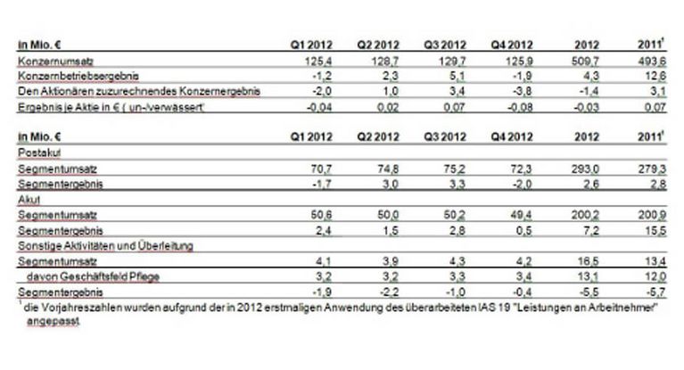 Vom Umsatzanstieg in Höhe von 16,1 Mio. Euro entfielen auf das Segment Postakut 13,7 Mio. Euro. Der Umsatz im Segment Akut ging um 0,7 Mio. Euro leicht zurück. Das Ergebnis des Segments Postakut liegt aufgrund eines starken Belegungsrückgangs zum Jahresende 2012 bei 2,6 Mio. Euro (2011: 2,8 Mio. Euro). Das Segmentergebnis Akut verminderte sich im Berichtsjahr von 15,5 Mio. Euro auf 7,2 Mio. Euro, da Mehrleistungen nicht oder nicht vollständig vergütet wurden und insbesondere die Personalkosten gegenüber dem Vorjahr gestiegen sind. Die Entwicklung im Geschäftsfeld Pflege ist sehr erfreulich, der Umsatz stieg um 1,1 Mio. Euro auf 13,1 Mio. Euro, die Auslastung lag bei 96,2 % (2011: 94,7%).