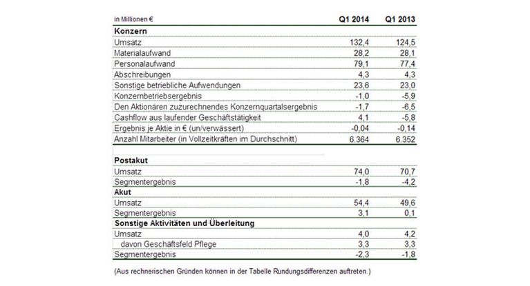 Im Quartalsvergleich lag der Umsatz des Segments Postakut in Höhe von 74,0 Mio. Euro um 3,3 Mio. Euro und der Umsatz des Segments Akut in Höhe von 54,4 Mio. Euro um 4,8 Mio. Euro oder 9,8 % über dem jeweiligen Vorjahreswert. Das Geschäftsfeld Pflege weist mit 3,3 Mio. Euro einen Umsatz auf Vorjahresniveau aus. Die höheren Umsatzerlöse und die unterproportional zum Umsatz gestiegenen Aufwendungen führten zu Ergebnisverbesserungen in den beiden vorstehend genannten Segmenten. Das Segmentergebnis Postakut betrug -1,8 Mio. Euro (Q1 2013: -4,2 Mio. Euro), das Ergebnis des Segments Akut 3,1 Mio. Euro (Q1 2013: 0,1 Mio. Euro).