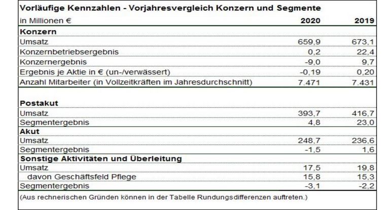 Im Segment Postakut sank der Umsatz um 23,0 Mio. Euro oder 5,5 % auf 393,7 Mio. Euro (Vorjahr: 416,7 Mio. Euro). Das vorläufige Segmentergebnis liegt bei 4,8 Mio. Euro (Vorjahr: 23,1 Mio. Euro).