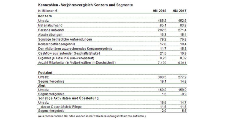 Die MEDICLIN Aktiengesellschaft (MEDICLIN) konnte in den ersten neun Monaten des Geschäftsjahres 2018 den Konzernumsatz gegenüber dem Vorjahreszeitraum um 32,7 Mio. Euro oder 7,2 % auf 485,2 Mio. Euro steigern. Kapazitätserweite-rungen und höhere Fallzahlen haben im Wesentlichen zum Umsatzplus beigetragen. Den größten Anteil am Umsatzanstieg hatte mit 22,6 Mio. Euro das Segment Postakut. Das Segment Akut steuerte 9,3 Mio. Euro bei.