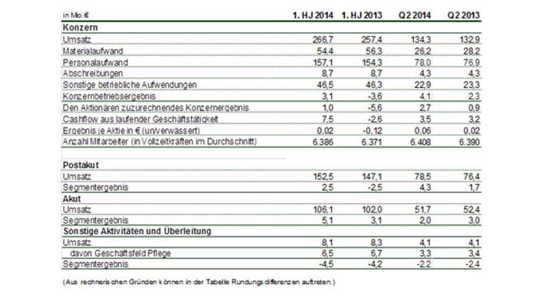 Die Umsatzerlöse der Segmente Postakut und Akut lagen im 1. Halbjahr 2014 um 5,4 Mio. Euro (+3,7 %) bzw. 4,1 Mio. Euro (+4,0 %) über den Vorjahreswerten. Lediglich der Umsatz des Geschäftsfelds Pflege reduzierte sich um 0,2 Mio. Euro auf 6,5 Mio. Euro. Aufgrund der höheren Umsätze und der moderat gestiegenen Aufwendungen verbesserte sich im 1. Halbjahr 2014 im Segment Postakut das Ergebnis um 5,0 Mio. Euro von -2,5 Mio. Euro auf +2,5 Mio. Euro und im Segment Akut um 2,0 Mio. auf 5,1 Mio. Euro gegenüber dem Vorjahreshalbjahr.