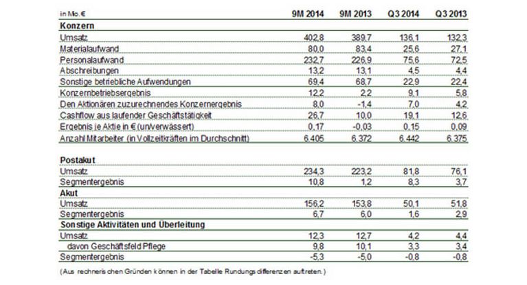 Ausschlaggebend für die gute Entwicklung im Konzern waren die sich im 3. Quartal 2014 im Segment Postakut sowohl gegenüber dem Vorjahr als auch gegenüber dem 1. und 2. Quartal 2014 fortgesetzte positive Umsatz- und Ergebnisentwicklung, sodass im 3. Quartal 2014 ein Konzernbetriebsergebnis in Höhe von 9,1 Mio. Euro erzielt werden konnte. Gut entwickelt haben sich insbesondere die Kliniken im Segment Postakut, in denen neben Rehabilitationsleistungen auch Leistungen der Akut-Neurologie oder Akut-Psychosomatik angeboten werden − auf diesem Ausbau lag der Fokus der Investitionen in den Jahren 2012 und 2013. Im Segment Akut wurde ein Segmentergebnis in Höhe von 6,7 Mio. Euro ausgewiesen, das um 0,7 Mio. Euro über dem Vorjahreswert lag.