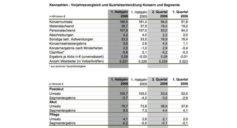In allen drei Segmenten zeigte sich eine positive Geschäftsentwicklung. Die Zahl der Fälle stieg im Segment Akut um 2,6% gegenüber dem Vorjahreswert, die Zahl der Pflegetage ging aufgrund der kürzeren Verweildauer um 2,2% zurück. Im Segment Postakut lag sowohl die Zahl der Pflegetage als auch die Zahl der Fälle um 0,5% über den Werten des 1. Halbjahres 2005. Im Segment Pflege stieg die Zahl der Pflegetage um 55,7%. Die durchschnittliche Auslastung im ersten Halbjahr 2006 lag bei diesen Einrichtungen bei 79,5% (Basis: 380 Betten), im Vorjahreshalbjahr bei 58,7% (Basis: 331 Betten).