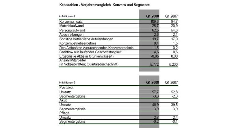 Die Umsatzerlöse im Segment Postakut stiegen um 4,9 Mio. Euro auf 57,7 Mio. Euro (Q1 2007: 52,8 Mio. Euro). Das Ergebnis verschlechterte sich um 1,0 Mio. Euro auf –3,3 Mio. Euro (Q1 2007: –2,3 Mio. Euro), im Wesentlichen aufgrund der um 1,9 Mio. Euro höheren Mietbelastung. Der Anteil der Anschlussheilbehandlung liegt einschließlich der neuerworbenen Häuser bei 61,1% (Q1 2007: knapp 64%). Im Segment Akut konnte der Umsatz um 9,4 Mio. Euro oder 23,8 % auf 48,9 Mio. Euro (Q1 2007: 39,5 Mio. Euro) gesteigert werden. Das Ergebnis lag unverändert bei 3,9 Mio. Euro. Die EBIT-Marge beträgt 8,0% (Q1 2007: 9,9%). Das Segment Pflege erzielte einen Umsatz von 2,7 Mio. Euro (Q1 2007: 2,4 Mio. Euro).