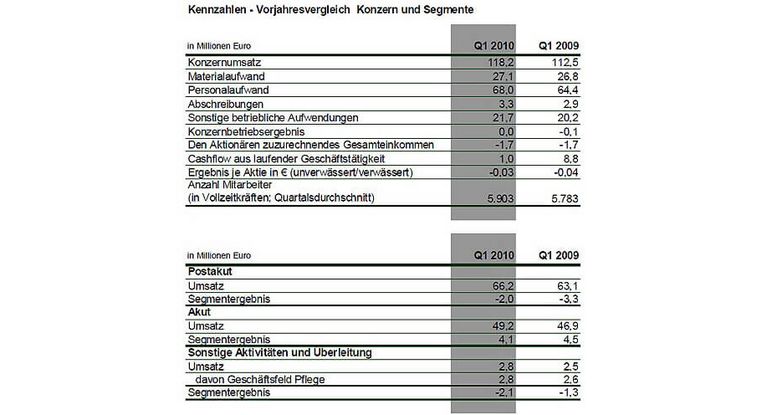 Der Umsatzanstieg konnte die höheren Kosten kompensieren, so dass sich das Quartals-Konzernbetriebsergebnis gegenüber dem vergleichbaren Vorjahreswert leicht verbessert hat (Q1 2010: -0,02 Mio. Euro; Q1 2009: -0,06 Mio. Euro). Das Segmentergebnis Postakut verbesserte sich um 1,3 Mio. Euro auf -2,0 Mio. Euro (Q1 2009: -3,3 Mio. Euro), das Segmentergebnis Akut betrug 4,1 Mio. Euro (Q1 2009: 4,5 Mio. Euro).