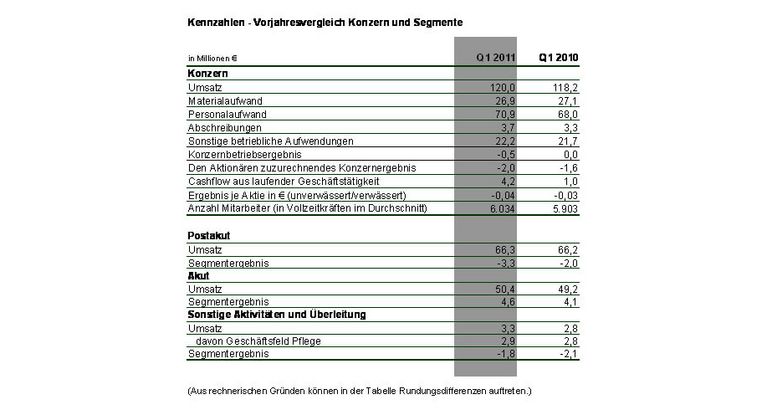 Trotz des gestiegenen Konzernumsatzes lag das Konzernbetriebsergebnis des 1. Quartals 2011 in Höhe von –0,5 Mio. Euro um 0,5 Mio. Euro unter dem Vorjahreswert. Ausschlaggebend hierfür waren im Wesentlichen die im Quartalsvergleich höheren Personalkosten (+2,9 Mio. Euro). Das den Aktionären der MediClin zuzurechnende Konzernergebnis beträgt –2,0 Mio. Euro (Q1 2010: -1,6 Mio. Euro)
